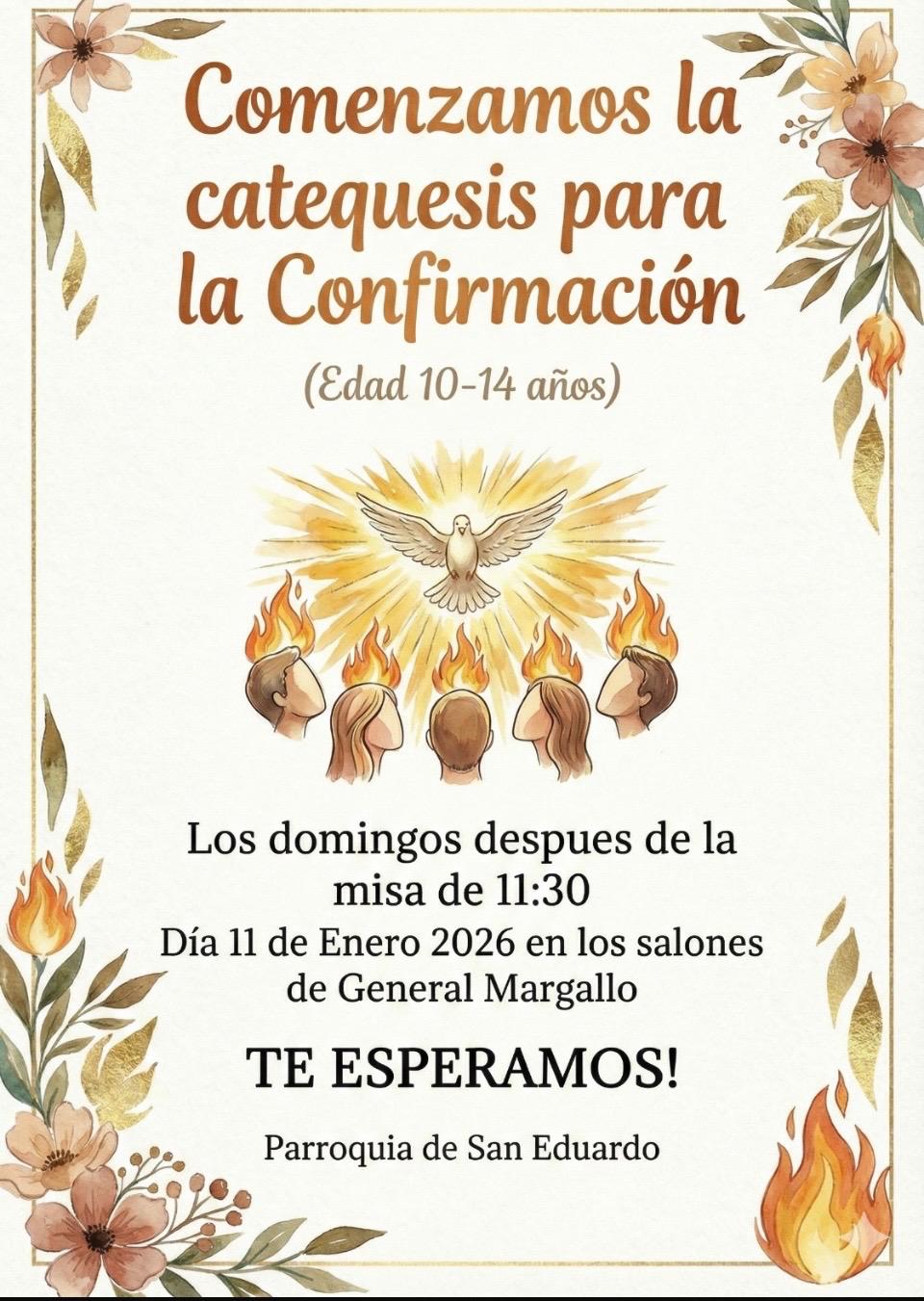 Inicio de la catequesis para la Confirmación el 11 de enero Los confirmandos tendrán la los encuentros los domingos después de la misa de 11:30.